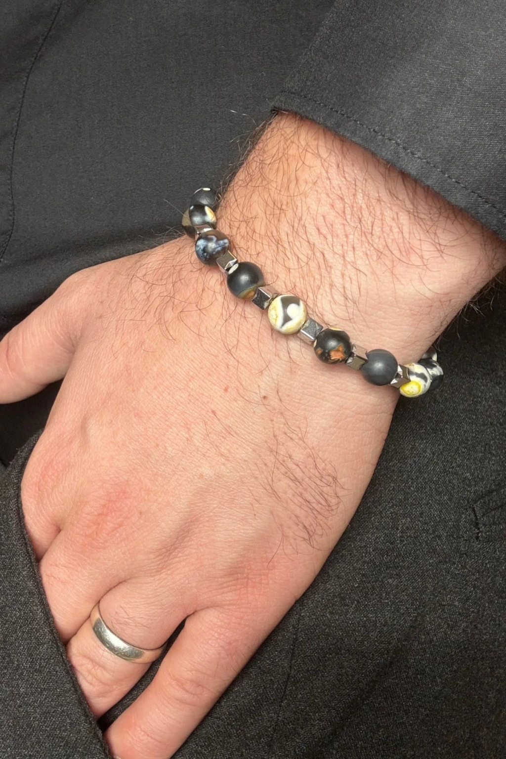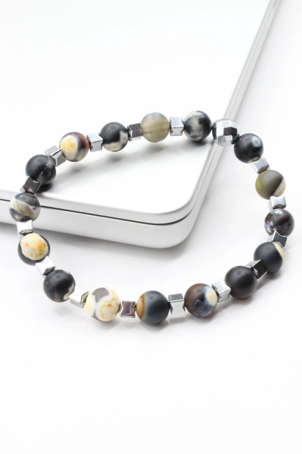 - Doğal akik taşı ile tasarlanmış, hem şıklığı hem de doğallığı bir arada sunan erkek bileklik.; ; - Hematit taşının eşsiz rengiyle dikkat çeken bu bileklik, her türlü kıyafetle uyum sağlar.; ; - Unisex tasarımı sayesinde hem kadınlar hem de erkekler tarafından rahatlıkla kullanılabilir.; ; - Tek beden seçeneğiyle geniş bir kullanıcı kitlesine hitap eder; herkes için idealdir.; ; - Çok renkli web color özelliğiyle göz alıcı bir görünüm kazandırırken, stilinizi tamamlar.